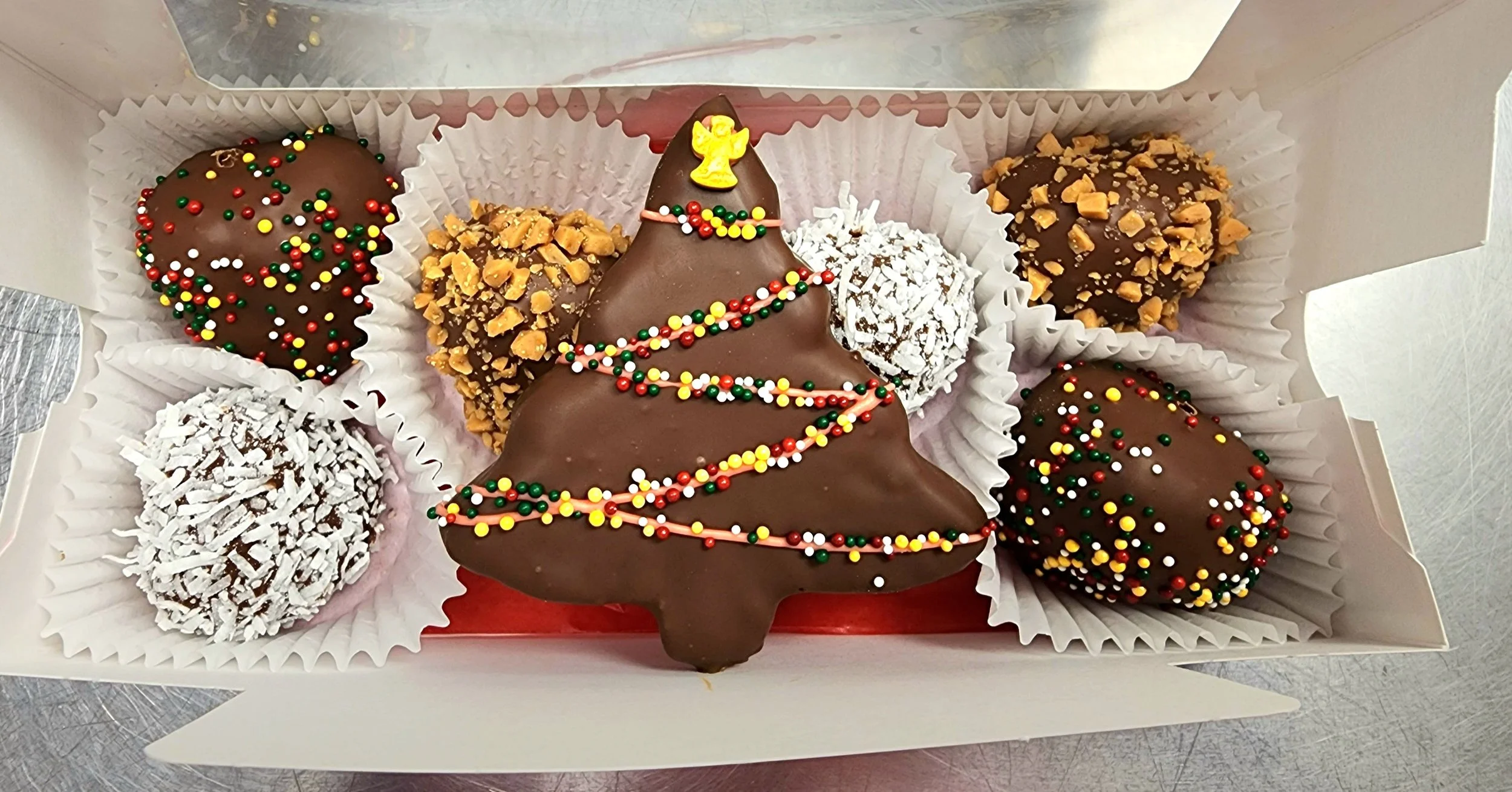 An all-around centerpiece with a vase full of baubles and topped with an arrangement seasonal flowers, winter greenery, Christmas baubles and golden ribbon.